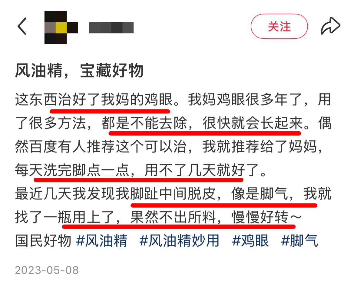 本来是奔着这网友说的治脚气去的 但却被她母亲,用风油精治好鸡眼的反馈吸引了注意