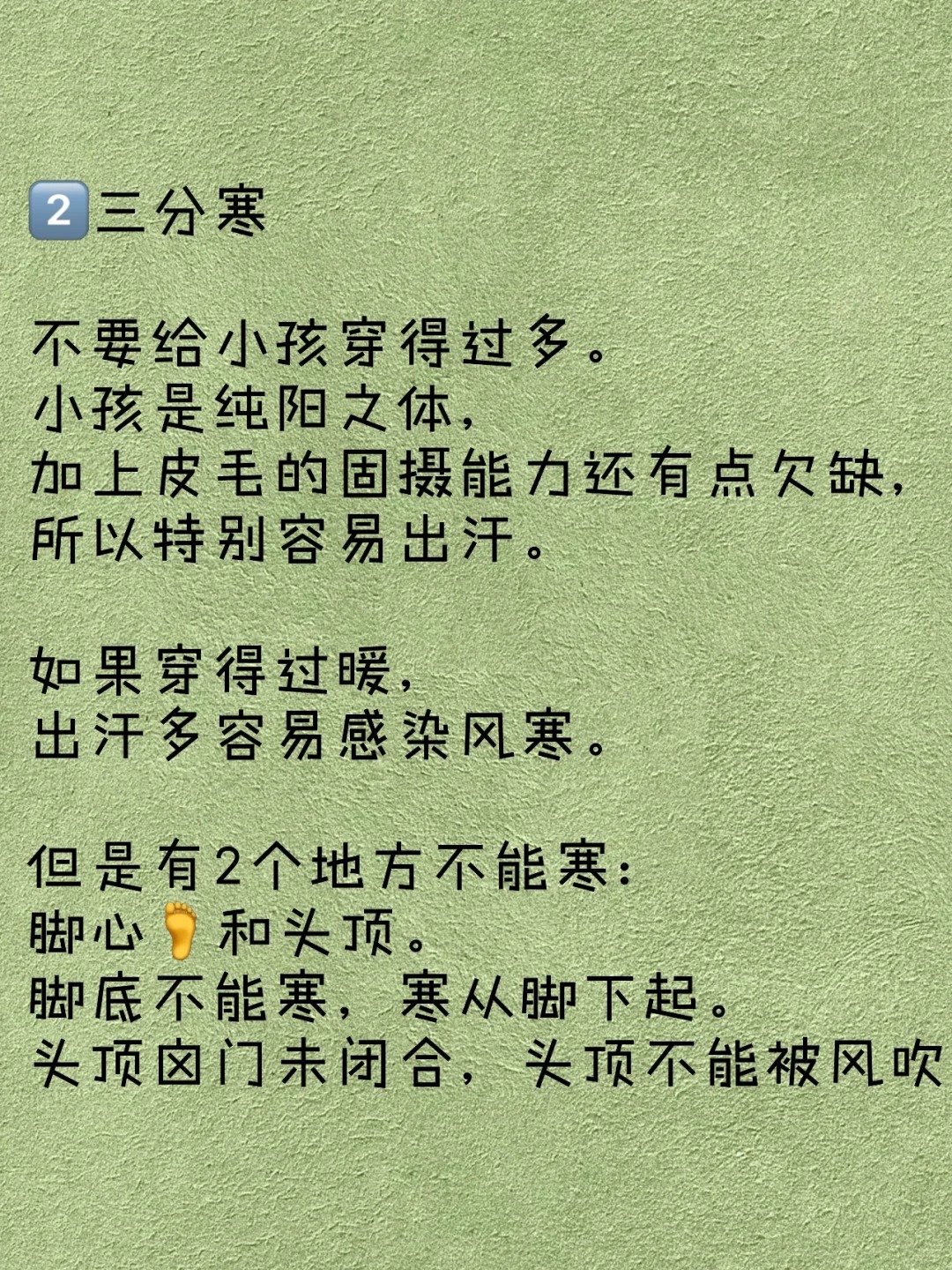 2️⃣三分寒 不要给小孩穿得过多。 小孩是纯阳之体,加上皮毛的固摄能力还有点欠缺, 所以特别容易出汗。 如果穿得过暖,出汗多容易感染风寒。 但是有2个地方不能寒:脚心🦶和头顶。 脚底不能寒,寒从脚下起。 头顶囟门未闭合,头顶不能被风吹。