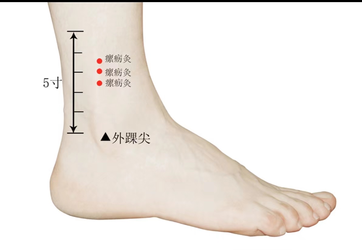 于小腿腓侧远侧端,外踝尖(男左女右)正中直上2.5、3、3.5寸处,共计3穴。